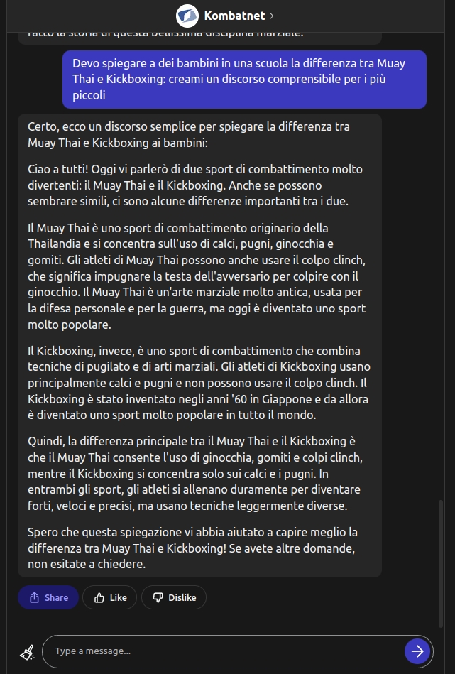 - Devo spiegare a dei bambini in una scuola la differenza tra Muay Thai e Kickboxing: creami un discorso comprensibile per i più piccoli