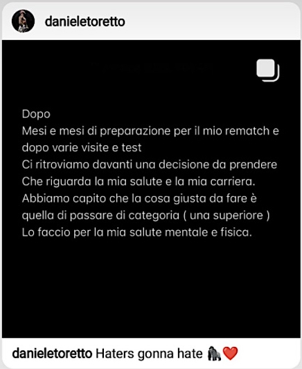 "Dopo mesi e mesi di preparazione per il mio rematch e dopo varie visite e test, ci ritroviamo davanti una decisione da prendere che riguarda la mia salute e la mia carriera. Abbiamo capito che la cosa giusta da fare è quella di passare di categoria (una superiore). Lo faccio nella mia salute e fisica. Ho bisogno di combattere ad armi pari contro chiunque. E fare quel taglio del peso di 15 kg comprometteva troppo la mia salute e in primis la mia prestazione atletica. Non ritengo giusto dopo tanti sacrifici per questo sport, che amo tantissimo e che è la mia vita, ritrovarmi sul ring dopo mesi di preparazione e non poter sentirmi me stesso, fisicamente e mentalmente”.